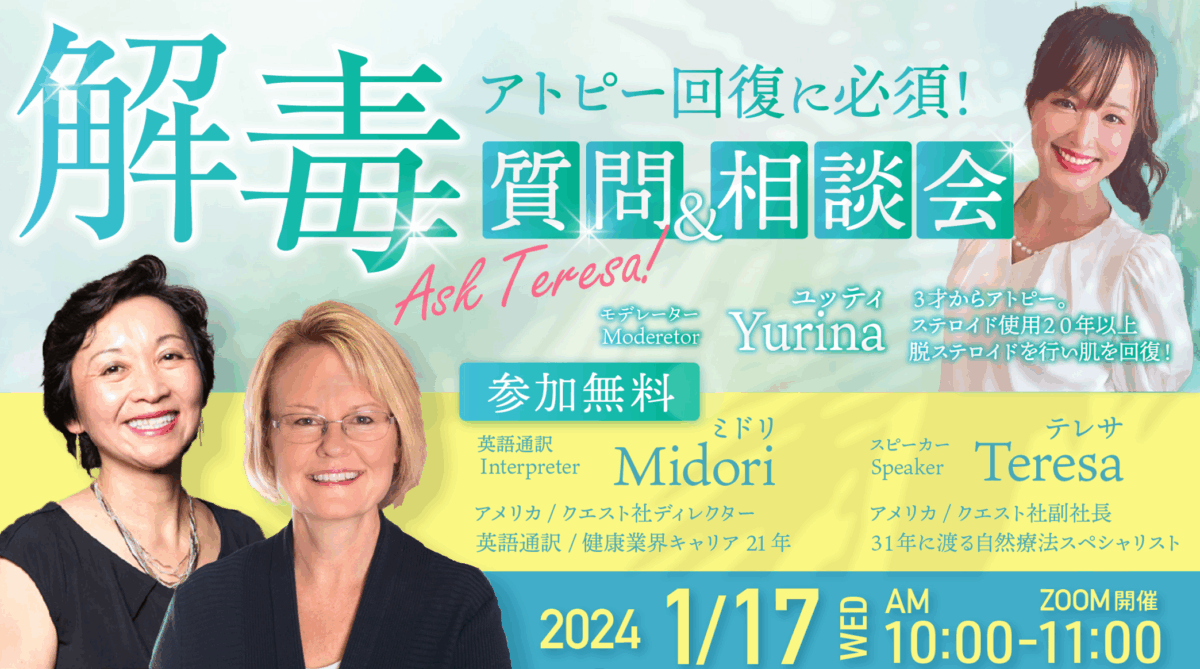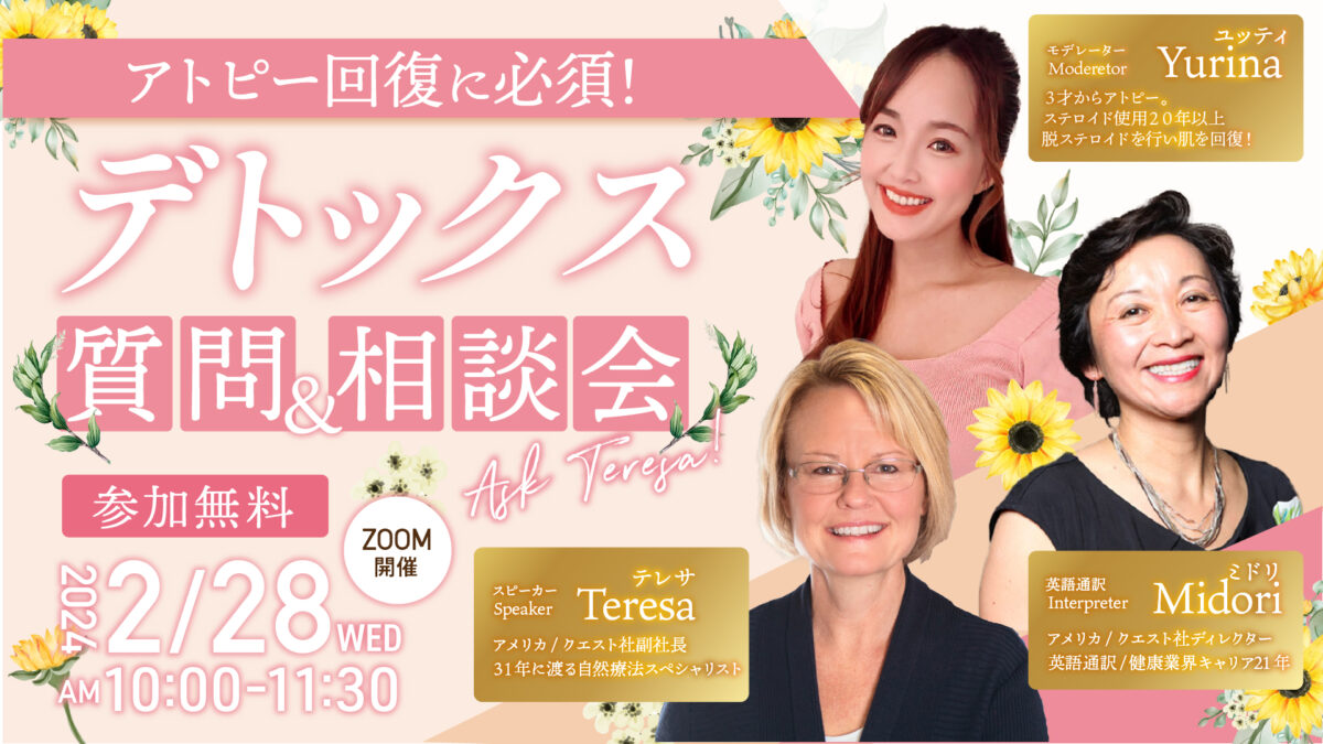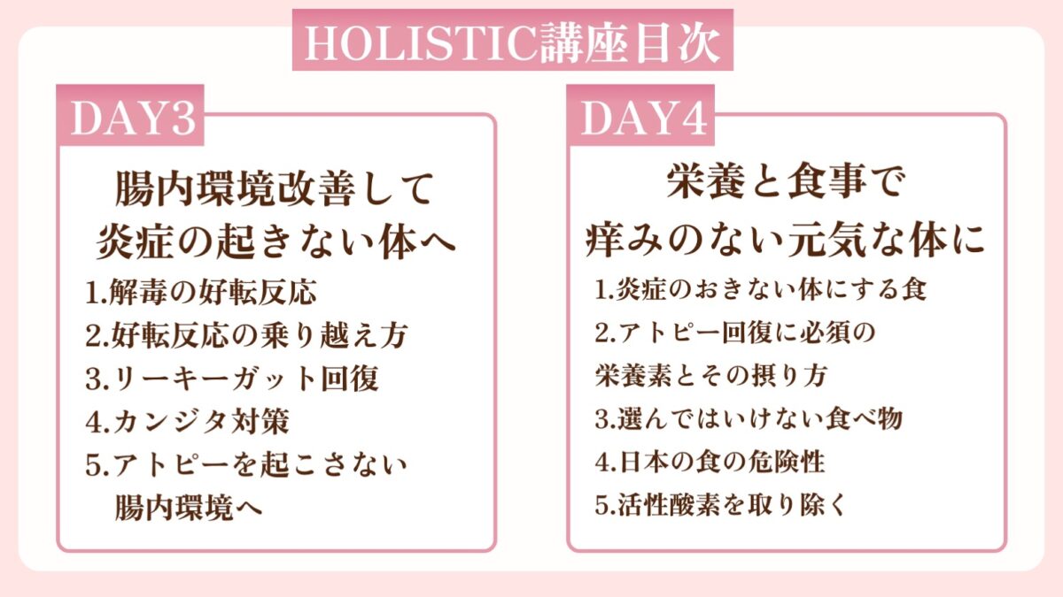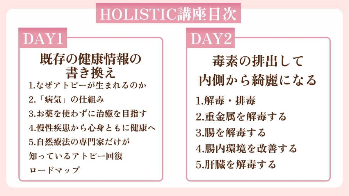 - アトピー回復に必要な食事、栄養、スキンケア、解毒、デトックスの詳しい方法が
